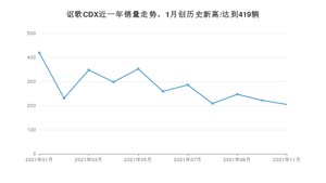 2021年11月,讴歌CDX销量为205辆,同比下降53.93%,环比下降7.66%。1-11月份,讴歌CDX销量为3076辆,同比下降36.82%。在最近1年中,讴歌CDX销量在2021年01月达到最高,销量为419辆。