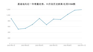 2021年11月,星途追风销量为1194辆,同比增长27.7%,环比增长1.7%。1-11月份,星途追风销量为9252辆,同比增长36.04%。在最近1年中,星途追风销量在2021年11月达到最高,销量为1194辆。