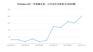 2021年11月,Polestar 2销量为203辆,同比增长448.65%,环比增长34.44%。1-11月份,Polestar 2销量为909辆,同比增长354.5%。在最近1年中,Polestar 2销量在2021年11月达到最高,销量为203辆。
