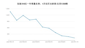 2021年11月,宝骏310销量为113辆,同比下降92.77%,环比下降36.87%。1-11月份,宝骏310销量为7548辆,同比下降46.77%。在最近1年中,宝骏310销量在2021年01月达到最高,销量为1358辆。