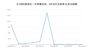 2021年11月,C-TREK蔚领销量为2辆,同比下降96.77%,环比下降33.33%。1-11月份,C-TREK蔚领销量为2988辆,同比增长57.02%。在最近1年中,C-TREK蔚领销量在2021年06月达到最高,销量为1630辆。