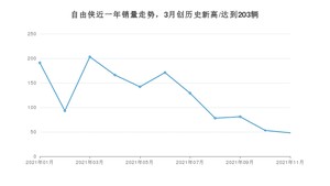 2021年11月,自由侠销量为48辆,同比下降79.4%,环比下降9.43%。1-11月份,自由侠销量为1355辆,同比下降57%。在最近1年中,自由侠销量在2021年03月达到最高,销量为203辆。