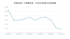 2021年11月,传祺GS3销量为795辆,同比下降77.43%,环比下降30.26%。1-11月份,传祺GS3销量为33160辆,同比增长3.28%。在最近1年中,传祺GS3销量在2021年01月达到最高,销量为5283辆。