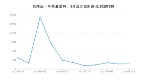 2021年11月,悦翔销量为286辆,同比下降92.98%,环比增长2.14%。1-11月份,悦翔销量为7397辆,同比下降64.9%。在最近1年中,悦翔销量在2021年03月达到最高,销量为2875辆。