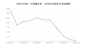 2021年11月,WEY VV6销量为51辆,同比下降98.22%,环比下降73.16%。1-11月份,WEY VV6销量为18780辆,同比下降32.35%。在最近1年中,WEY VV6销量在2021年01月达到最高,销量为3289辆。