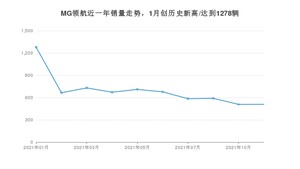 2021年11月,MG领航销量为509辆,同比下降45.09%,环比增长0.2%。1-11月份,MG领航销量为6924辆,同比增长646.93%。在最近1年中,MG领航销量在2021年01月达到最高,销量为1278辆。