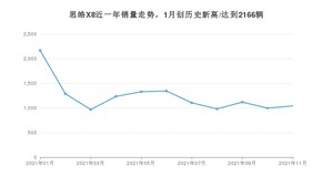 2021年11月,思皓X8销量为1042辆,同比增长18.01%,环比增长4.62%。1-11月份,思皓X8销量为13568辆,同比增长1%。在最近1年中,思皓X8销量在2021年01月达到最高,销量为2166辆。