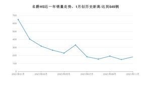 2021年11月,名爵HS销量为182辆,同比下降67.96%,环比增长22.15%。1-11月份,名爵HS销量为3060辆,同比下降74.23%。在最近1年中,名爵HS销量在2021年01月达到最高,销量为649辆。
