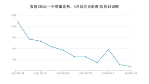 2021年11月,宝骏360销量为109辆,同比下降91.92%,环比下降33.54%。1-11月份,宝骏360销量为5975辆,同比下降70.93%。在最近1年中,宝骏360销量在2021年01月达到最高,销量为1312辆。
