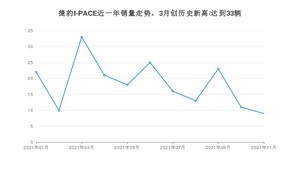 2021年11月,捷豹I-PACE销量为9辆,同比下降72.73%,环比下降18.18%。1-11月份,捷豹I-PACE销量为201辆,同比下降60.36%。在最近1年中,捷豹I-PACE销量在2021年03月达到最高,销量为33辆。