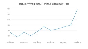 2021年11月,微蓝7销量为178辆,同比增长493.33%,环比增长95.6%。1-11月份,微蓝7销量为764辆,同比增长4.09%。在最近1年中,微蓝7销量在2021年11月达到最高,销量为178辆。