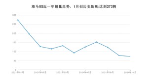 2021年11月,海马8S销量为73辆,同比下降69.58%,环比下降7.59%。1-11月份,海马8S销量为1489辆,同比下降66.63%。在最近1年中,海马8S销量在2021年01月达到最高,销量为273辆。
