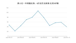 2021年11月,勇士销量为39辆,同比下降20.41%,环比下降33.9%。1-11月份,勇士销量为649辆,同比增长30.32%。在最近1年中,勇士销量在2021年06月达到最高,销量为107辆。