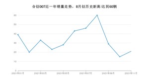 2021年11月,合创007销量为21辆,同比下降65%,环比增长40%。1-11月份,合创007销量为357辆,同比下降1.11%。在最近1年中,合创007销量在2021年08月达到最高,销量为60辆。