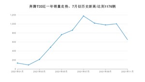 2021年11月,奔腾T33销量为650辆,同比增长537.25%,环比下降35.13%。1-11月份,奔腾T33销量为7359辆,同比增长68.17%。在最近1年中,奔腾T33销量在2021年07月达到最高,销量为1176辆。