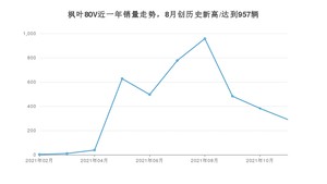 2021年11月,枫叶80V销量为291辆,环比下降23.82%。1-11月份,枫叶80V销量为4063辆,在最近1年中,枫叶80V销量在2021年08月达到最高,销量为957辆。