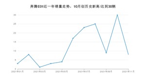2021年11月,奔腾E01销量为8辆,同比下降38.46%,环比下降73.33%。1-11月份,奔腾E01销量为131辆,同比增长627.78%。在最近1年中,奔腾E01销量在2021年10月达到最高,销量为30辆。