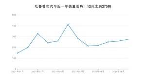2021年12月,吐鲁番市汽车总销量为275辆,同比增长8.27%,环比增长6.59%。1-12月份,吐鲁番市总销量为3080辆,同比增长45.08%。在最近1年中,吐鲁番市销量在2021年06月达到最高,销量为412辆。