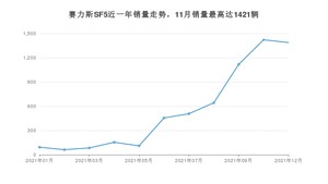 2021年12月,赛力斯SF5销量为1388辆,同比增长984.38%,环比下降2.32%。1-12月份,赛力斯SF5销量为6033辆,同比增长642.98%。