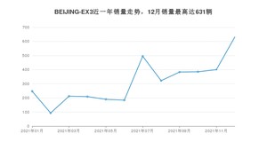 2021年12月,北京汽车品牌总体销量达到5268辆,其中BEIJING-EX3销量达到631辆,占品牌总销量的11.98%。