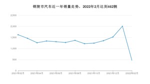 2022年2月,铜陵市汽车总销量为462辆,同比下降71.5%,环比下降76.98%。2021年02月-2022年02月份,铜陵市总销量为17421辆,同比增长1.17%。在最近1年中,铜陵市销量在2022年01月达到最高,销量为2007辆。