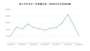 2022年2月,海口市汽车总销量为5043辆,同比下降10.07%,环比下降62.98%。2021年02月-2022年02月份,海口市总销量为150340辆,同比增长34.83%。在最近1年中,海口市销量在2021年12月达到最高,销量为21103辆。