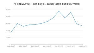 2022年2月,宏光MINI EV销量为26541辆,同比增长46.11%,环比下降10.39%。2021年02月-2022年02月份,宏光MINI EV销量为420389辆,同比增长163.44%。