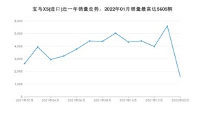 2022年2月,宝马X5(进口)销量为1548辆,同比下降41.16%,环比下降72.38%。2021年02月-2022年02月份,宝马X5(进口)销量为50182辆,同比下降3.06%。