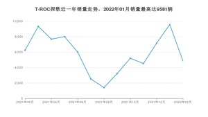 2022年2月,T-ROC探歌销量为4851辆,同比下降22.4%,环比下降49.37%。2021年02月-2022年02月份,T-ROC探歌销量为75732辆,同比下降32.78%。