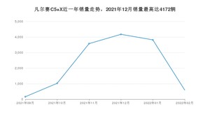 2022年2月,凡尔赛C5 X销量为593辆,环比下降84.47%。2021年02月-2022年02月份,凡尔赛C5 X销量为13343辆,