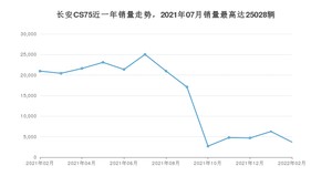 2022年2月,长安CS75销量为3693辆,同比下降82.39%,环比下降41.15%。2021年02月-2022年02月份,长安CS75销量为192703辆,同比下降38.08%。