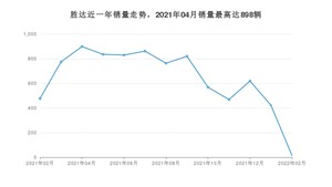 2022年2月,胜达销量为14辆,同比下降97.06%,环比下降96.67%。2021年02月-2022年02月份,胜达销量为8345辆,同比下降28.21%。