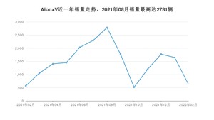 2022年2月,Aion V销量为650辆,同比增长13.64%,环比下降60.51%。2021年02月-2022年02月份,Aion V销量为19156辆,同比增长120.36%。
