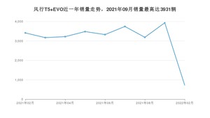 2022年2月,风行T5 EVO销量为724辆,同比下降78.77%,2021年02月-2022年02月份,风行T5 EVO销量为28184辆,同比增长186.74%。