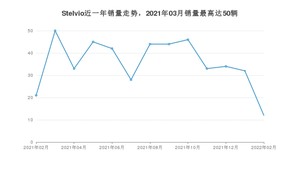 2022年2月,Stelvio销量为12辆,同比下降42.86%,环比下降62.5%。2021年02月-2022年02月份,Stelvio销量为464辆,同比下降13.27%。