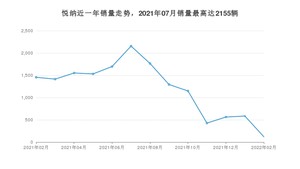 2022年2月,悦纳销量为120辆,同比下降91.75%,环比下降79.49%。2021年02月-2022年02月份,悦纳销量为15704辆,同比下降38.9%。