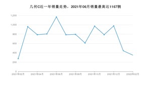 2022年2月,几何C销量为350辆,同比增长27.27%,环比下降21.17%。2021年02月-2022年02月份,几何C销量为9715辆,同比增长89.15%。