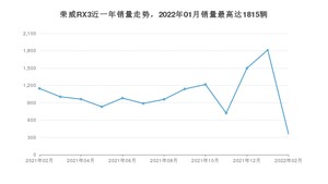2022年2月,荣威RX3销量为362辆,同比下降68.44%,环比下降80.06%。2021年02月-2022年02月份,荣威RX3销量为13521辆,同比下降20.85%。