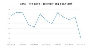 2022年2月,创界销量为28辆,同比下降83.63%,环比下降82.72%。2021年02月-2022年02月份,创界销量为1884辆,同比下降65.2%。