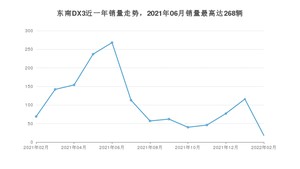 2022年2月,东南DX3销量为18辆,同比下降73.91%,环比下降84.48%。2021年02月-2022年02月份,东南DX3销量为1399辆,同比下降53.18%。
