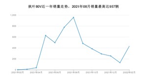 2022年2月,枫叶80V销量为431辆,同比增长21%,环比增长234.11%。2021年02月-2022年02月份,枫叶80V销量为4878辆,同比增长243%。