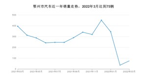 2022年3月,鄂州市汽车总销量为75辆,同比下降81.01%,环比增长114.29%。2021年03月-2022年03月份,鄂州市总销量为3581辆,同比下降12.98%。在最近1年中,鄂州市销量在2021年12月达到最高,销量为451辆。