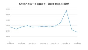 2022年3月,亳州市汽车总销量为1801辆,同比下降34.34%,环比下降19.17%。2021年03月-2022年03月份,亳州市总销量为38132辆,同比增长0.07%。在最近1年中,亳州市销量在2022年01月达到最高,销量为5733辆。
