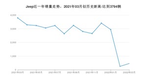 在国内市场上,Jeep在2022年3月的销量为461辆,同比下降87.85%,环比增长82.94%。2021年03月-2022年03月份,Jeep累计销量为35021辆,较去年同期下降40.47%。