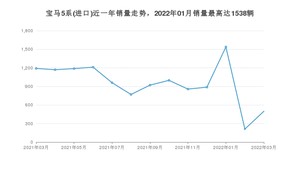 2022年3月,宝马5系(进口)销量为498辆,同比下降58.19%,环比增长136.02%。2021年03月-2022年03月份,宝马5系(进口)销量为12401辆,同比下降16.65%。