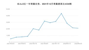 2022年3月,ID.4 X销量为2095辆,同比增长323.23%,环比下降3.14%。2021年03月-2022年03月份,ID.4 X销量为27404辆,同比增长5%。