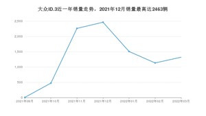 2022年3月,大众ID.3销量为1319辆,环比增长16.52%。2021年03月-2022年03月份,大众ID.3销量为9157辆,