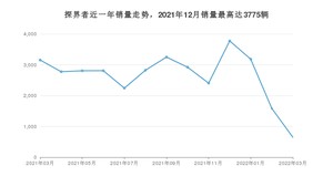 2022年3月,探界者销量为647辆,同比下降79.5%,环比下降59.18%。2021年03月-2022年03月份,探界者销量为34385辆,同比下降22.63%。