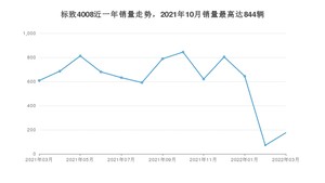 2022年3月,标致4008销量为175辆,同比下降71.22%,环比增长146.48%。2021年03月-2022年03月份,标致4008销量为7954辆,同比下降3.05%。