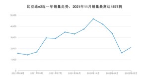 2022年3月,比亚迪e2销量为2105辆,同比增长34.5%,环比增长31.81%。2021年03月-2022年03月份,比亚迪e2销量为37023辆,同比增长75.56%。